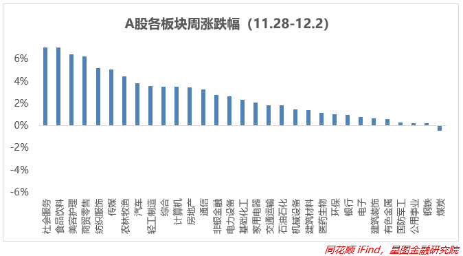上周A股三大指数盘中均有跳空高开,多方力量强大,尤其是上证指数一度上涨至3200点附近,触及半年线,深证成指和创业板指则调转方向,在周内涨幅都要超过上证指数,也都跨过60日均线,而且两市成交量接连出现放量超过万亿,或许是由于从中央到地方皆有防疫政策的积极调整所致。疫情方面,周内国务院联防联控机制综合组、国务院副总理联合多位专家召开多次会议商讨调整优化措施,从效果来看超出预期,截至12月4日周内新增本土确诊病例达28458例,日均增量峰值超过4200例,同期环比增加26%,增速有所下滑。