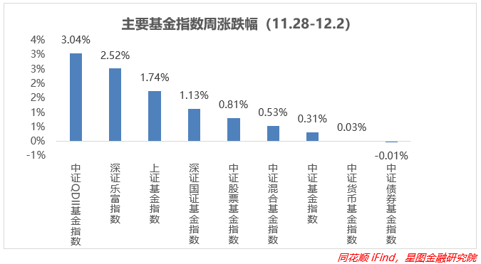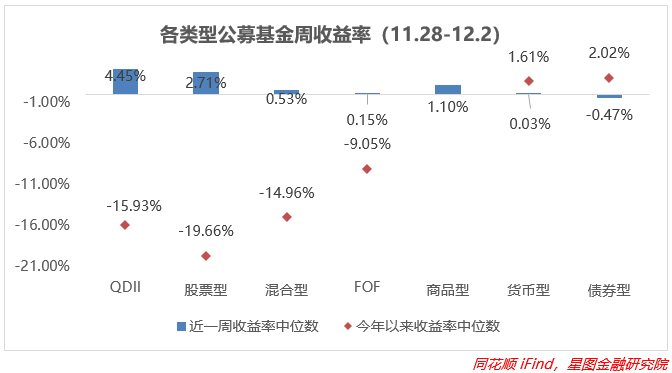 上周QDII型基金收益率中枢最高,在外围带动下收益进一步放大,年内收益同样有所大幅回暖,环比+3.45pct;股票型、混合型基金受股票走势影响跟涨,分别上涨1.70%、0.54%;债券型基金周/年收益率中枢环比均有所改善,是所有基金中唯一的类型,但在周内依旧领跌所有基金;其余类型基金跌幅都在0%到0.4%之间;货币型基金继续积累收益。