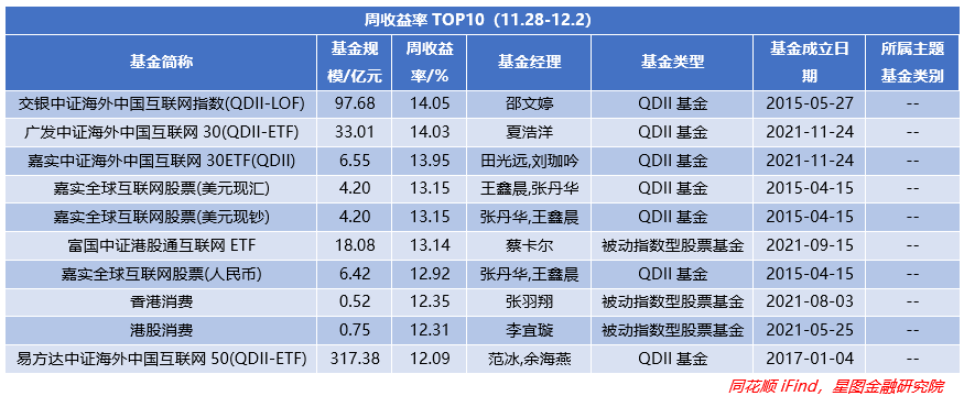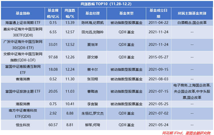 从涨跌幅(A/C基金以A类或排名靠前为准,QDII美元/人民币以排名靠前为准)TOP10来看,被动指数型基金和QDII型基金各占50%;且相关基金持续受益于央国企改革、中字头标的。整体涨幅则回升至1.89%,环比+3.4pct。最高涨幅回落4.66pct至13.39%,为海富通基金旗下基金。