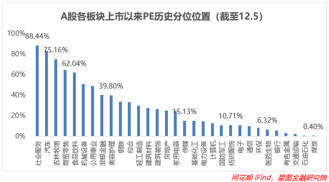 从上市以来板块分位值来看,截至12月5日收盘,全部板块估值实现上修。受地产政策的刺激,大金融板块估值修复最大,其中非银金融、银行分别环比+15.21pct、+3.87pct;大消费板块在居民出行预期转向的情况下大举反攻,其中食品饮料、美容护理、社会服务、纺织服饰、商贸零售环比均+4pct以上;传统行业在大行情的带动下同样收涨,不过涨幅不大。板块估值中位数为家用电器(24.71%)。