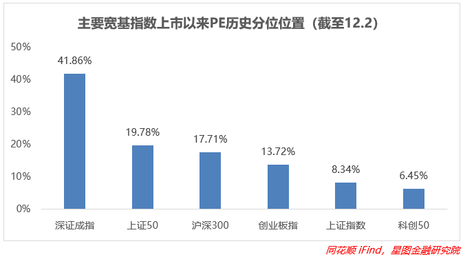 从上市以来分位值来看,上周几大指数估值上修幅度都不小,尤其是代表核心资产的上证50和沪深300,受到央行降准、管控政策边际好转的影响,市场对A股的估值迎来重大向好预期,二者环比分别+6.62pct、+3.99pct,估值分位均靠近20%;深证成指再次回升至40%;A股的整体估值开始向合理区间靠拢,相较而言科创板依旧处于低位,可持续关注。