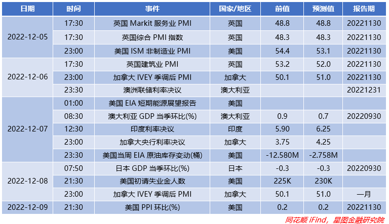 美国方面,美国商务部11月30日公布的修正数据显示,今年第三季度美国国内生产总值(GDP)按年率计算增长2.9%,较10月底发布的初次数据上调0.3个百分点。当日美联储主席鲍威尔证实,该行或将在12月放慢加息步伐。他解释称,现在的央行利率已接近抑制水平,足以使美国通胀率持续下降,这个时候放慢加息是有意义的。此外由于需求疲软,11月美国商业活动连续第五个月收缩,11月标准普尔全球综合采购经理人指数估值下滑至46.3,表明商业活动收缩。美国11月ADP就业人数增加12.7万人,为2021年1月以来的最低水平。美国10月核心PCE物价指数环比升0.2%,同比升5.0%;10月PCE物价指数环比升0.3%,同比升6.0%,低于前值和预期。