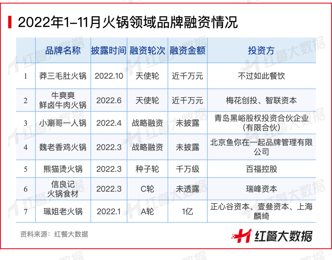 光从投融资事件数上来看,2022年火锅赛道融资数量跟去年相当。据红餐大数据,2022年1-11月,火锅领域发生了7起投融资事件,跟去年全年的火锅赛道融资数量差不多。