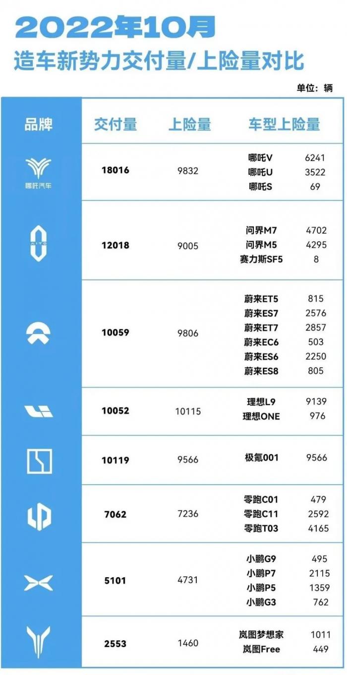 今年1-11月,蔚来、理想、小鹏、零跑、哪吒5家造车新势力年内交付均跨过了十万辆门槛,分别为10.67万辆、11.2万辆、10.95万辆、10.27万辆和14.43万辆,同比分别增长31.79%、46.61%、33.24%、185%和142.29%。