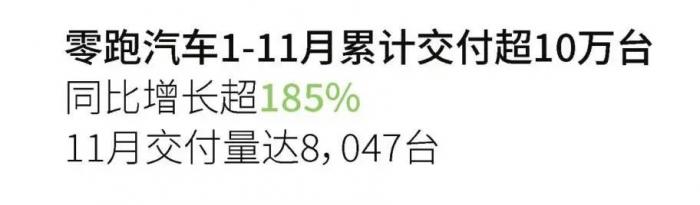 但以“黑马之姿”加速的零跑交出了一份亮眼的成绩单——今年前11个月累计交付跨越十万辆生死门槛,以185%的同比增速超越一众造车新势力。