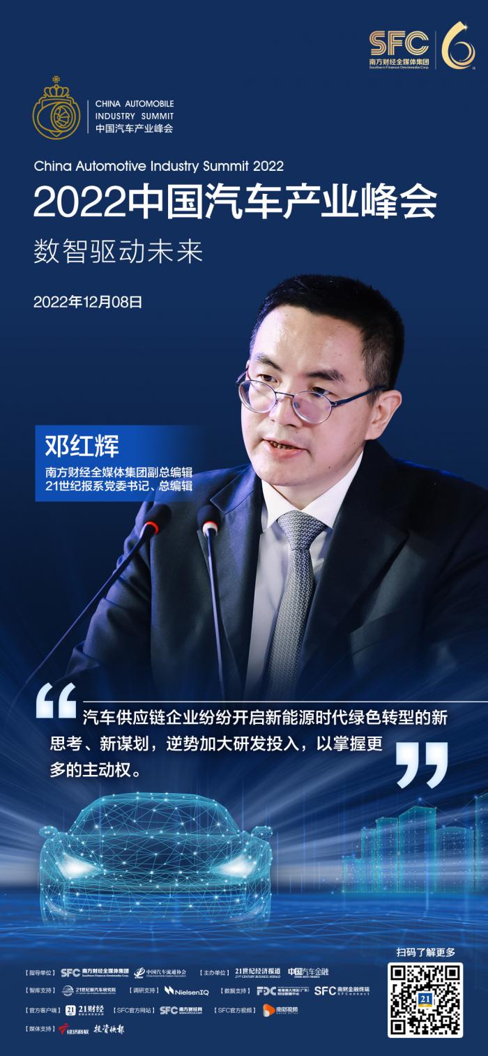 在应对严峻挑战的同时,世界和中国汽车产业正在通过改革与创新发生深刻变革。12月8日,在由21世纪经济报道主办的“2022中国汽车新创峰会”线上论坛上,南方财经全媒体集团副总编辑、21世纪报系党委书记、总编辑邓红辉在开幕致辞中指出,“自动化、电动化、软件化等技术浪潮持续推动行业转型升级,供应链企业纷纷开启新能源时代绿色转型的新思考、新谋划,逆势加大研发投入,以掌握更多的主动权。”
