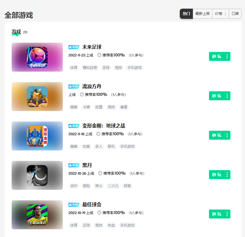 从世界杯开始至今,这两款游戏均未进入到安卓、iOS主流渠道的前100,SensorTower显示的下载数据分别为13万和17万,流水均在70万元以下。即便在咪咕快游自家平台,也未进入热门启动游戏的前20。在其评价数据里,半个月内均只有1人参与评价推荐,而头部的《原神》云游戏则有超过4700人参与评价推荐。