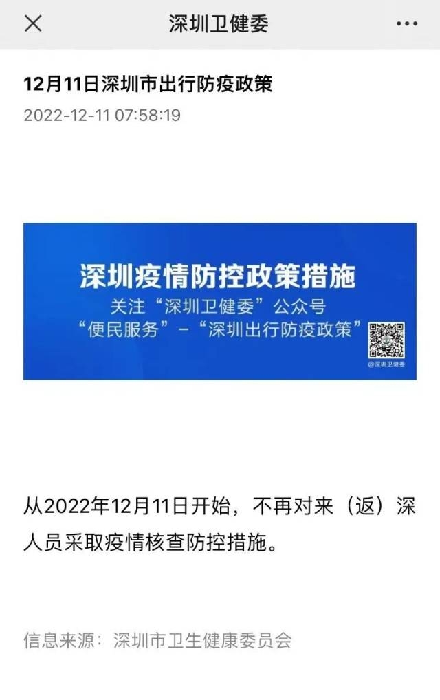 从2022年12月11日开始,不再对来(返)深人员采取疫情核查防控措施。