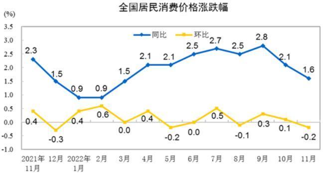 12月9日,国家统计局发布的数据显示,今年11月份,全国CPI(居民消费价格指数)环比下降0.2%,同比上涨1.6%,涨幅比上月回落0.5个百分点;PPI(工业生产者出厂价格指数)环比微涨0.1%;同比继续下降1.3%,降幅与上月相同。
