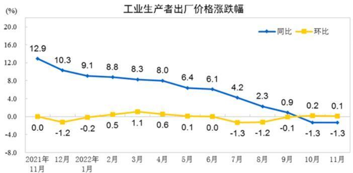 据测算,在11月份1.3%的PPI同比降幅中,去年价格变动的翘尾影响约为-1.2个百分点,新涨价影响约为-0.1个百分点。