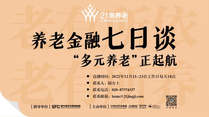 作为一家全国性专业财经媒体,21世纪经济报道及旗下“21惠养老”栏目,近年来致力于成为政府、机构与投资者互动的桥梁。基于越来越多中青年读者对养老话题的关注,21世纪经济报道、“21惠养老”通过整合内外部资源,于2022年12月15日-12月23日期间,倾力打造首届“21惠养老|国民养老金融素养活动周”,每日一个主题、多场直播及音视频,内容涵盖专家访谈、主题论坛、报纸和APP特刊等,及时、深度、全方位呈现大众关注的养老内容。