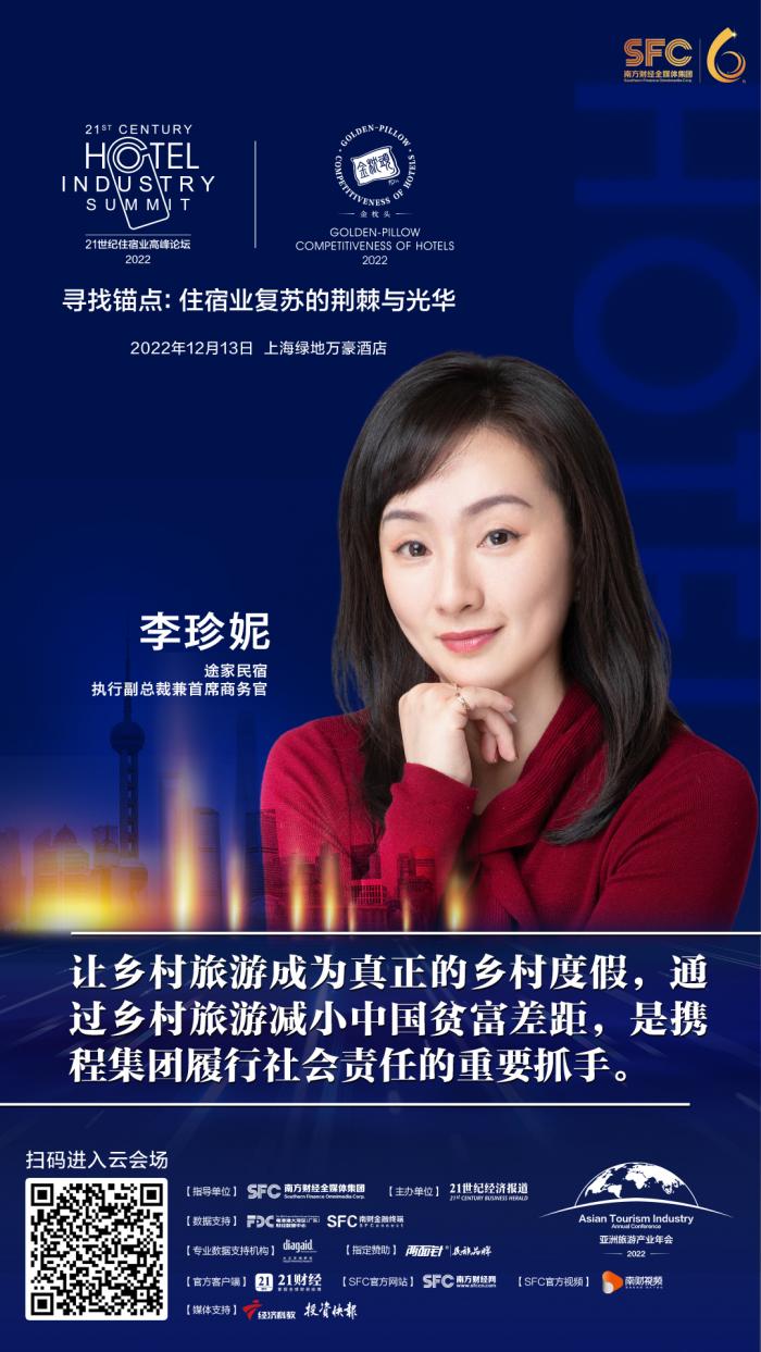12月13日,由南方财经全媒体集团指导,21世纪经济报道主办的“21世纪住宿业高峰论坛(2022)暨2022(第十九届)【金枕头】酒店大赏发布典礼”在上海举行。途家民宿执行副总裁兼首席商务官李珍妮发表了题为《民宿消费新亮点》的主旨演讲,发布了途家对民宿行业的深度观察,并分享了乡村旅游振兴的发展样本。