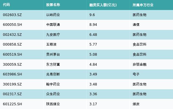 昨日两市共有3088只个股有融资资金买入,其中以岭药业、中国联通、九安医疗排名前三,买入金额分别9.6亿元、8.94亿元、6.48亿元。融资买入额前10个股详情见下表: