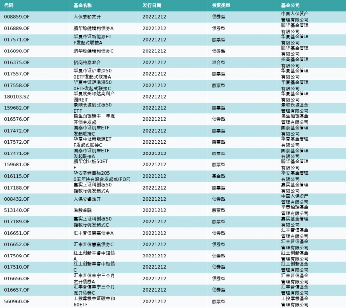 (12月12日,下同)有26只新基金发行,分别为:人保安和定开、鹏华稳健增利债券A、华夏中证新能源ETF发起式联接A、鹏华稳健增利债券C、招商裕泰混合、华夏中证沪港深500ETF发起式联接A、华夏中证沪港深500ETF发起式联接C、华夏杭州和达高科产园REIT、景顺长城创业板50ETF、民生加银瑞丰一年定开债券发起、国泰中证机床ETF发起联接C、华夏中证新能源ETF发起式联接C、国泰中证机床ETF发起联接A、鹏华创业板50ETF、华安养老目标2050五年持有混合发起式(FOF)、嘉实上证科创板50指数增强发起式A、人保安睿定开、港股金融、嘉实上证科创板50指数增强发起式C、汇丰晋信慧嘉债券A、汇丰晋信慧嘉债券C、红土创新丰睿中短债A、红土创新丰睿中短债C、汇丰晋信丰宁三个月定开债券A、汇丰晋信丰宁三个月定开债券C、上投摩根中证碳中和60ETF,详情见下表: