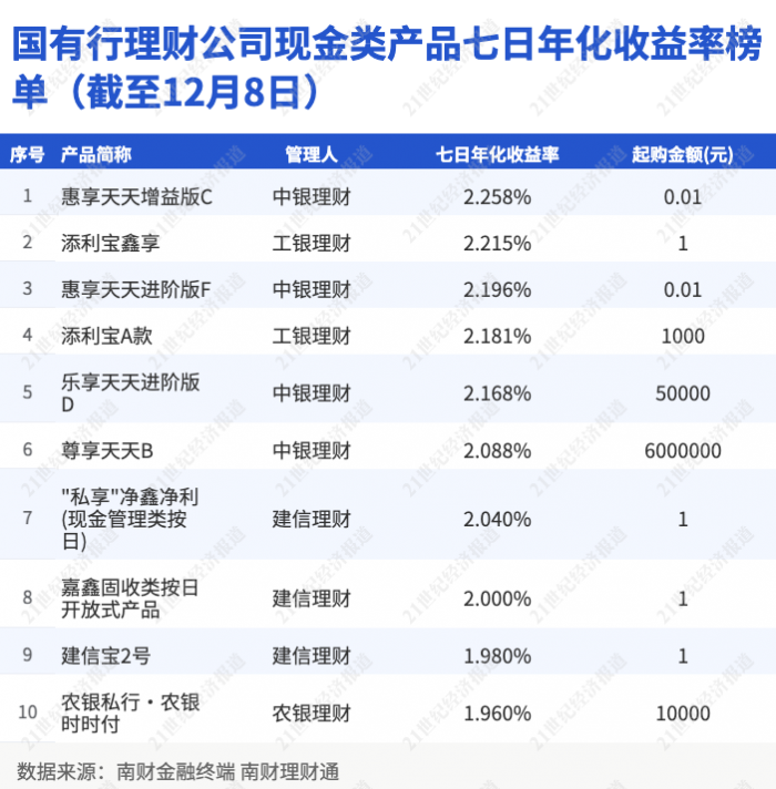 国有行理财公司现金管理类产品收益表现(截至12月8日)