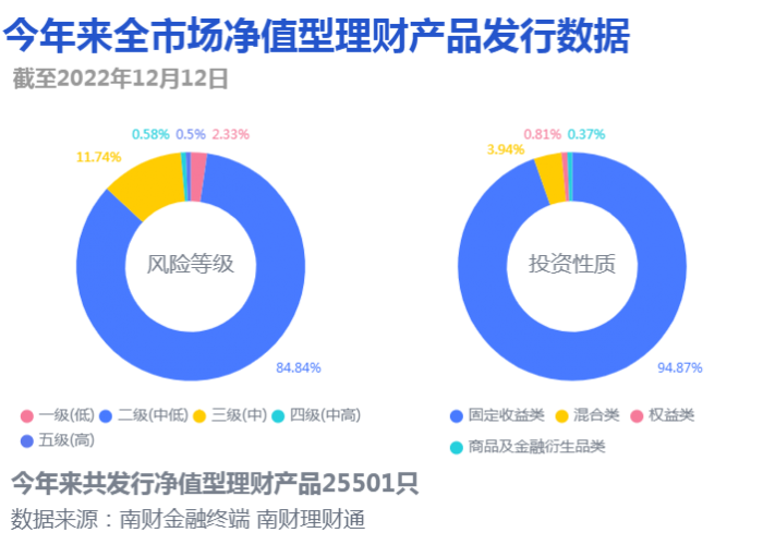 南财金融终端、南财理财通数据显示,截至2022年12月12日,今年以来,全国发行净值型银行理财产品25,501只。其中,一级(低风险)产品占比2.33%,二级(中低风险)产品占比84.84%,三级(中风险)产品占比11.74%,四级(中高风险)产品占比0.58%,五级(高风险)产品占比0.5%。