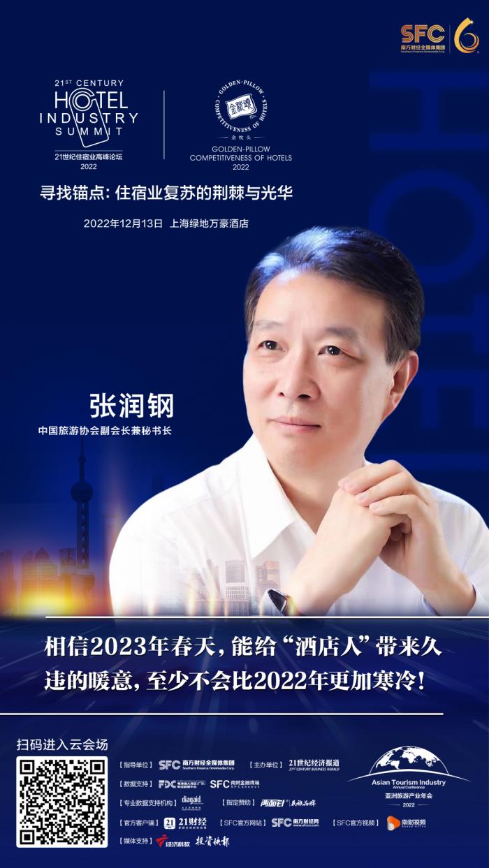 12月13日,由南方财经全媒体集团指导,21世纪经济报道主办的“21世纪住宿业高峰论坛(2022)”在上海举行。中国旅游协会副会长兼秘书长张润钢在论坛上表示,近日国家对防疫政策做出了重大调整,为住宿业的复苏带来了希望,他预计2023年下半年会出现较为全面复苏。张润钢同时提醒道,“复苏很可能主要体现在量上,对人均消费,或者说房价的期望不可过分乐观。”他还提示大家要特别关注上海酒店出现的各种信号。