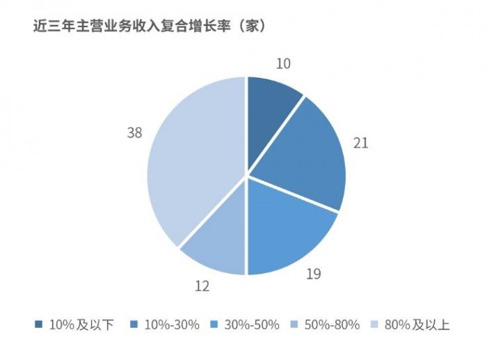 第一个关键词是成长,企业普遍处于高速发展阶段。从100家调研企业成长能力相关数据看,近三年主营业务收入复合增长率在50%以上的企业占比达50%,其中增长率在80%以上的企业占比为38%,可见企业发展的速度非常迅速。