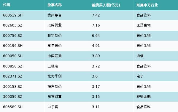 昨日两市共有3088只个股有融资资金买入,其中贵州茅台、以岭药业、新华制药排名前三,买入金额分别7.42亿元、7.16亿元、6.64亿元。融资买入额前10个股详情见下表: