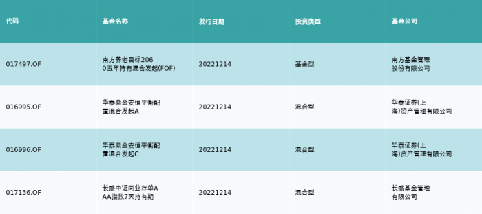 (12月14日,下同)有4只新基金发行,分别为:南方养老目标2060五年持有混合发起(FOF)、华泰紫金安恒平衡配置混合发起A、华泰紫金安恒平衡配置混合发起C、长盛中证同业存单AAA指数7天持有期,详情见下表: