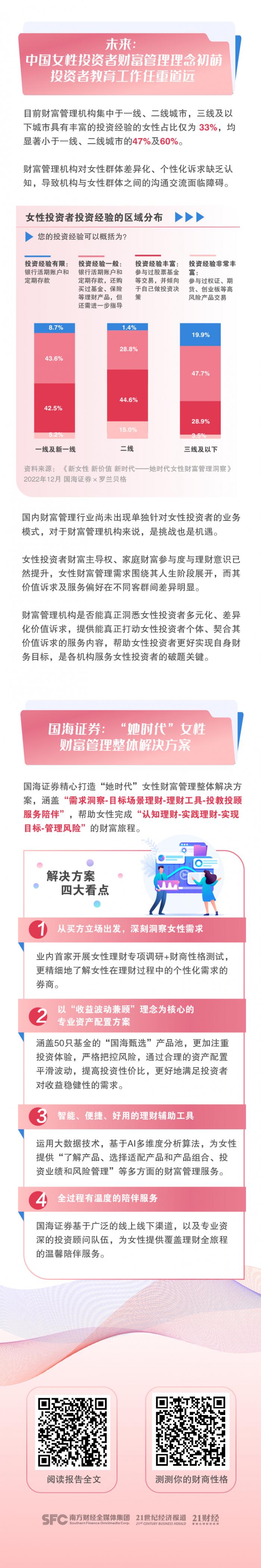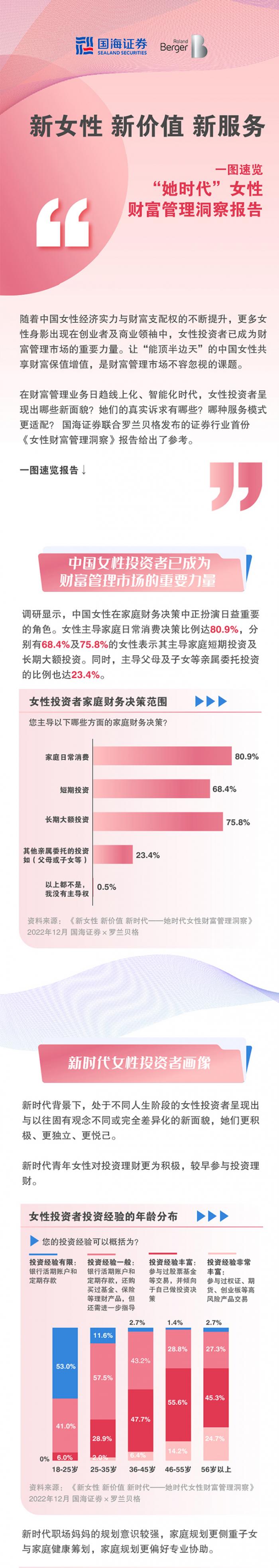 12月16日, 国海证券联合知名咨询公司罗兰贝格发布证券行业首份女性财富管理白皮书《新女性 新价值 新服务—— ”她时代“女性财富管理洞察》,深入分析女性投资者价值诉求,协助女性投资者建立更美好的财富...