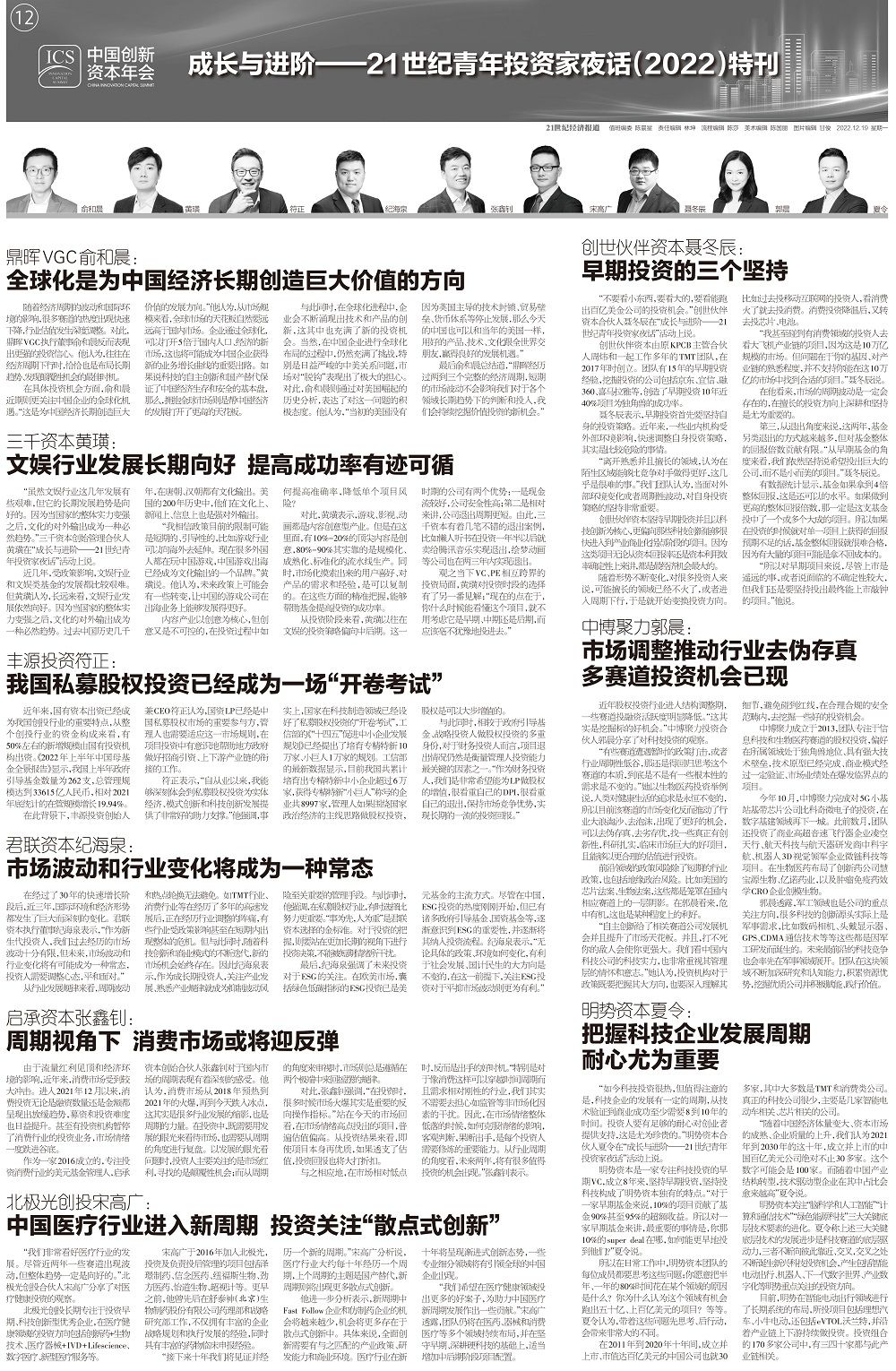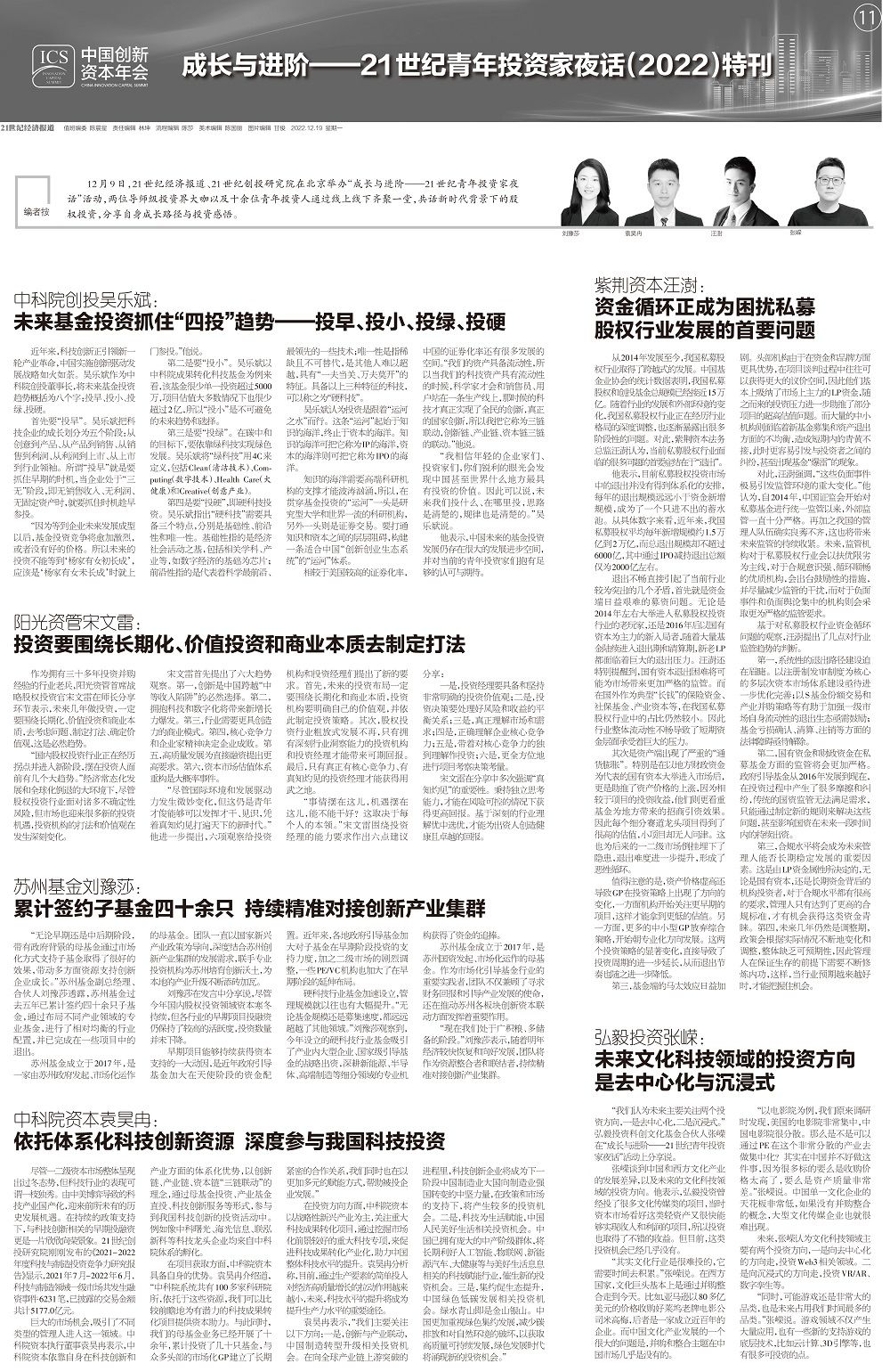 12月9日,21世纪经济报道、21世纪创投研究院在北京举办“成长与进阶——21世纪青年投资家夜话”活动,两位导师级投资界大咖以及十余位青年投资人通过线上线下齐聚一堂,共话新时代背景下的股权投资,分享自身成长路径与投资感悟。