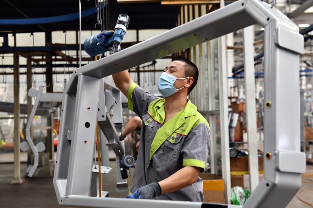 在山东罗赛罗德健康产业有限公司,工作人员在加工健身器材(2022年6月1日摄)。新华社记者 郭绪雷 摄
