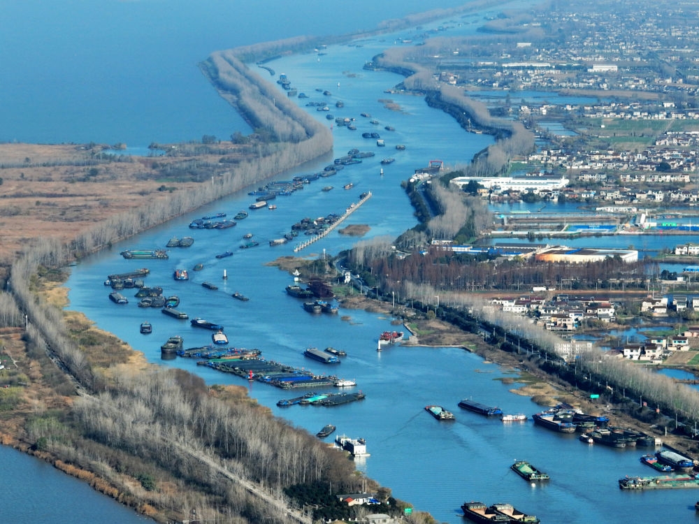 12月18日,货船行驶在京杭大运河江苏扬州段(无人机照片)。新华社发(孟德龙摄)