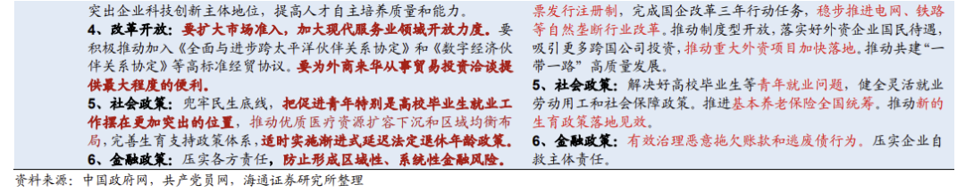 扩大内需:消费放在更优先的位置。会议强调“把实施扩大内需战略同深化供给侧结构性改革有机结合起来”,指出把恢复和扩大消费摆在优先位置,政策强调“收入”对扩大消费的作用,消费领域强调了“住房、新能源、养老”。投资方面,加快实施“十四五”重大工程,加强区域间基础设施联通,强调带动全社会投资,聚焦重大项目和补短板项目。外贸方面,要继续发挥出口对经济的支撑作用,“积极扩大先进技术、重要设备、能源资源等产品进口”。