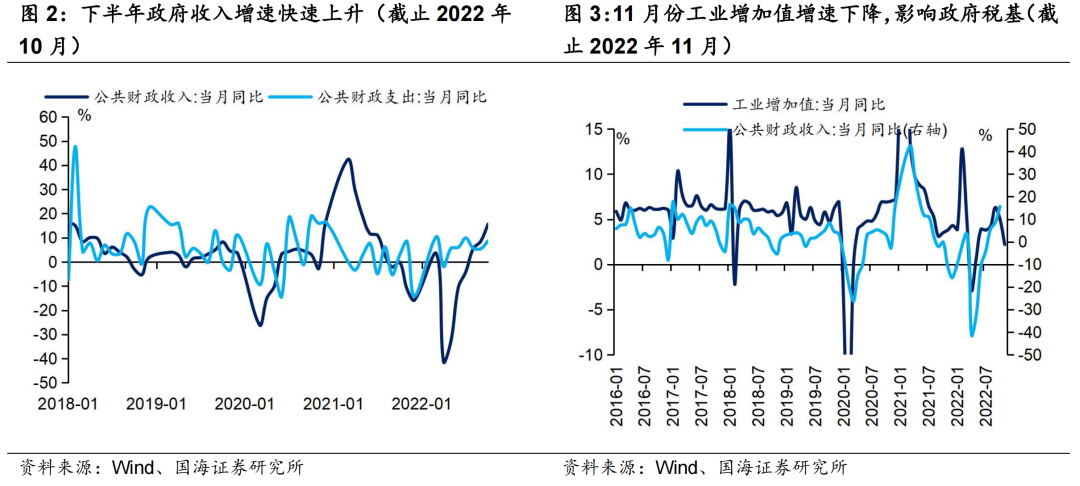 近期工业生产和消费增速边际下滑,影响政府税基。11月份规模以上工业增加值同比增长2.2%,较上月下行2.8个百分点。预计未来一个季度疫情扰动经济期间,政府税基将持续性受到扰动。