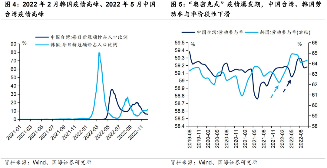 在12月12日报告《2023年通胀展望》中,我们探讨了疫情对于生产的长期影响。以韩国、中国台湾为例,奥密克戎疫情爆发后,当地劳动参与率、劳动时间并未出现长期下行,与美国、英国等地“疫后缺工”的现象不同,这可能与东亚地区劳动文化、劳动福利体系有关,因此我们认为疫情反复对供给侧和通胀的长期影响可控。