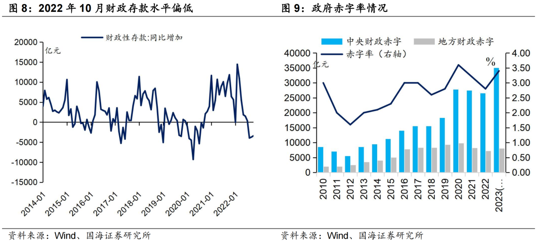 从财政政策来看,2023年减税力度下降,政府收入增速可能较2022年更高,政府存款规模届时由下降转为重新增长,对债市资金面不利。与此同时,政府赤字率扩大后,相比于政府减退税给企业、再由企业间接投资,政府直接投资到基建等领域,“宽信用”的效果可能更加快速明显,对债市而言也同样偏利空。