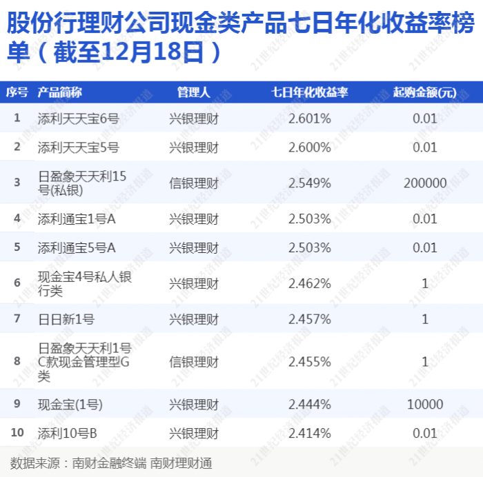 据南财理财通数据,截至12月18日,在股份行理财公司现金管理产品七日年化收益排行榜中,仅兴银理财、信银理财两家机构上榜,其中兴银理财占据8席,信银理财占据2席,其余股份行理财公司均无产品上榜。