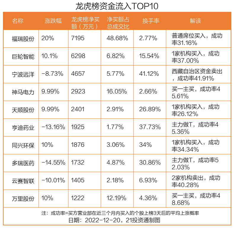 12月20日,上证指数下跌1.07%,深证成指下跌1.58%,创业板指下跌1.53%。盘后龙虎榜数据显示,共有44只个股因当日异动登上龙虎榜,资金净流入最多的是福瑞股份(300049.SZ),达0.72亿元。