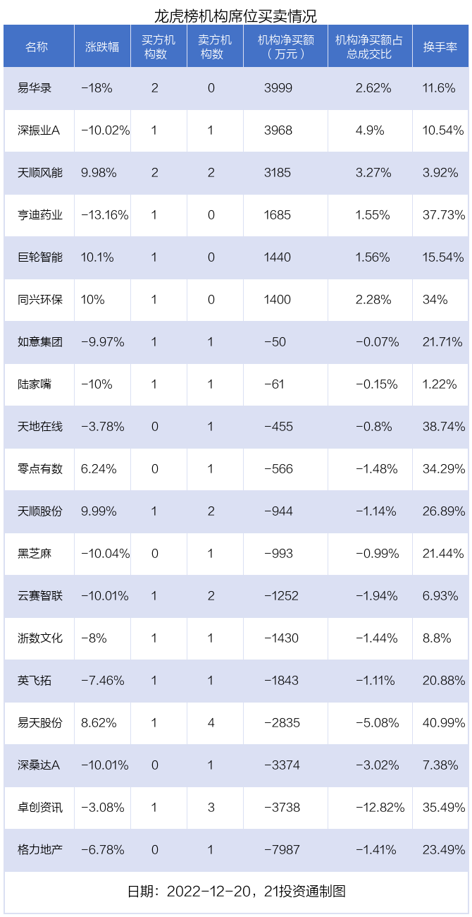 其中,机构净买入金额最多的是易华录(300212.SZ),当日收盘下跌18%,换手率为11.6%。