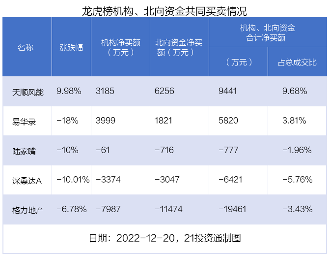 值得注意的是,机构和北向资金共同净买入了天顺风能、易华录等2股;共同净卖出了陆家嘴、深桑达A、格力地产等3股。