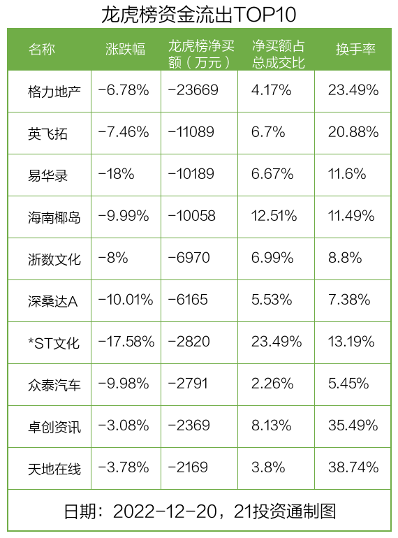 而龙虎榜中资金净流出最多的是格力地产(600185.SH),被净卖出为2.37亿元,占总成交金额的4.17%。格力地产收盘下跌6.78%,换手率为23.49%。