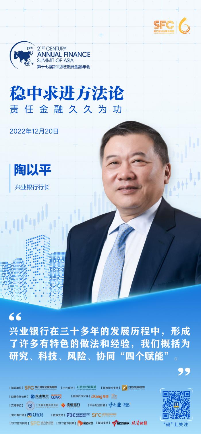 21世纪经济报道记者 朱英子 北京报道 12月20日,由南方财经全媒体集团、21世纪经济报道主办的第十七届21世纪亚洲金融年会于线上召开,主题为:稳中求进方法论 责任金融久久为功,兴业银行行长陶以平出席会议并发表主题演讲。