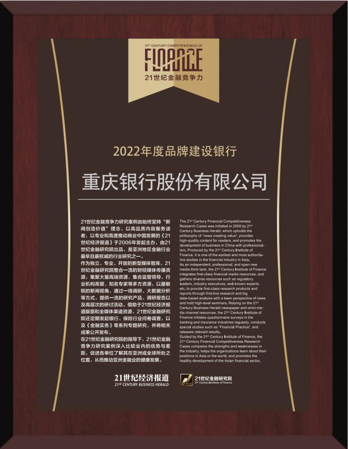 据了解,21金融竞争力评选活动依托于21世纪金融研究院,建立了具有金融竞争力评判标准的权威评价体系,通过公开透明的客观数据,对亚洲范围内金融机构进行全面梳理及研究,并挖掘出年度优秀样本案例,以表彰卓越的金融机构及领军人物,旨在为亚洲金融展示标杆力量,推动行业的健康发展。本届评选活动吸引了数百家金融机构报名参选,在备受瞩目的银行业“2022年度品牌建设银行”角逐中,重庆银行脱颖而出,一举夺得此奖项。