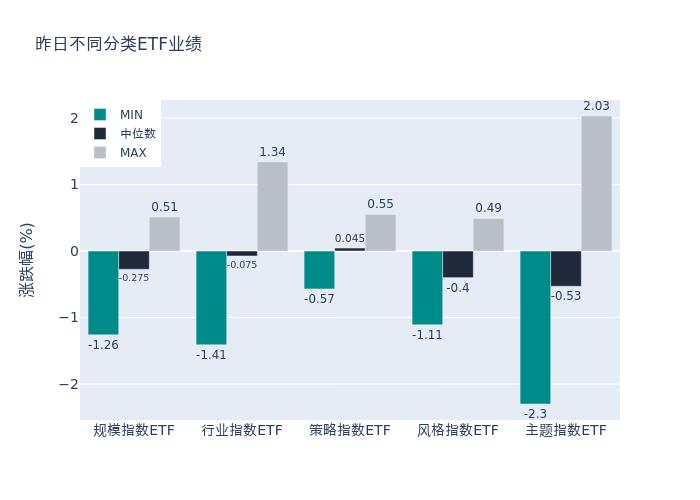 昨日股票型ETF收益率中位数为-0.31%。其中按照不同分类,规模指数中A50ETF收益率最高,为0.51%;行业指数中香港医药收益率最高,为1.34%;策略指数中工银深红利ETF收益率最高,为0.55%;风格指数中招商中证银行AH价格优选ETF收益率最高,为0.49%;主题指数中华夏中证旅游主题ETF收益率最高,为2.03%。