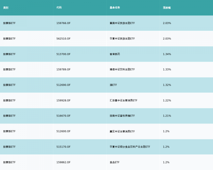 昨日股票型ETF涨幅最高的3支ETF及其收益率分别为:富国中证旅游主题ETF(2.03%)、华夏中证旅游主题ETF(2.03%)、香港医药(1.34%)。涨幅前10详情见下表: