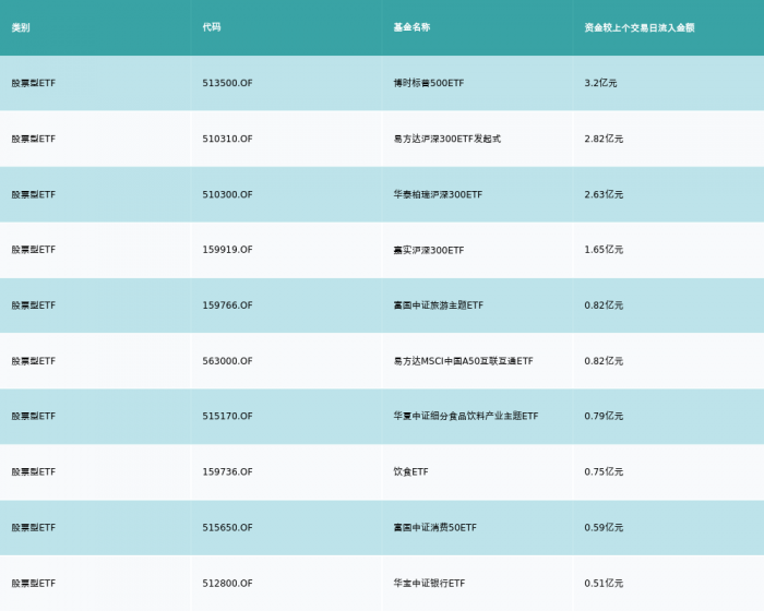昨日股票型ETF资金流入最多的3支ETF及其流入金额分别为:博时标普500ETF(流入3.2亿元)、易方达沪深300ETF发起式(流入2.82亿元)、华泰柏瑞沪深300ETF(流入2.63亿元)。资金流入前10详情见下表: