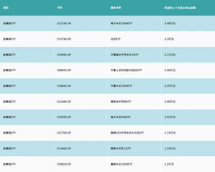 昨日股票型ETF资金流出最多的3支ETF及其流入金额分别为:南方中证1000ETF(流出3.46亿元)、光伏ETF(流出3.3亿元)、华夏国证半导体芯片ETF(流出2.71亿元)。资金流出前10详情见下表: