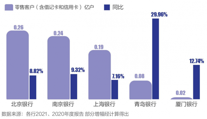 相比大行与股份行,城商行的零售客户数量较少。但在2021年内,有部分城商行客户数量增幅显著。譬如,青岛银行零售客户同比增长29.96%。青岛银行表示,该行深耕客群夯实基础,分层经营优化结构,零售业务继续深化“全产品、全渠道、全客群”体系建设。