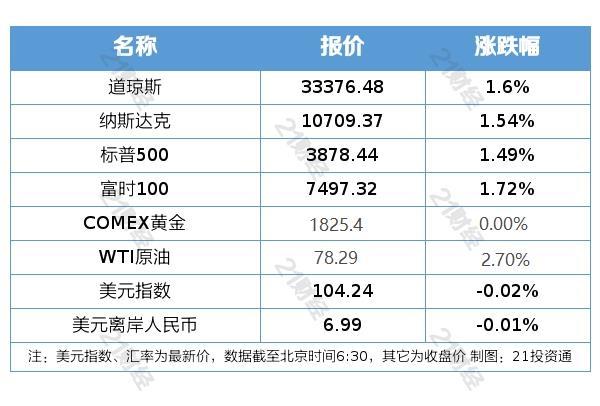 纽约股市三大股指21日显著上涨。截至当天收盘,道琼斯工业平均指数比前一交易日上涨526.74点,收于33376.48点,涨幅为1.60%;标准普尔500种股票指数上涨56.82点,收于3878.44点,涨幅为1.49%;纳斯达克综合指数上涨162.26点,收于10709.37点,涨幅为1.54%。
