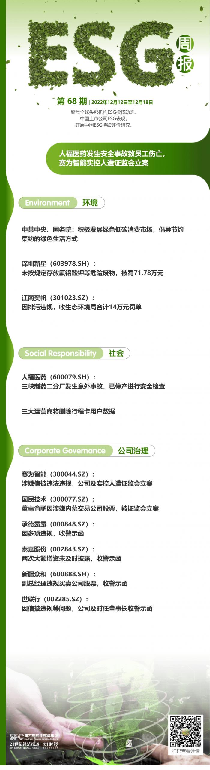 ESG周报(第68期)丨人福医药发生安全事故致员工伤亡,赛为智能实控人遭证监会立案