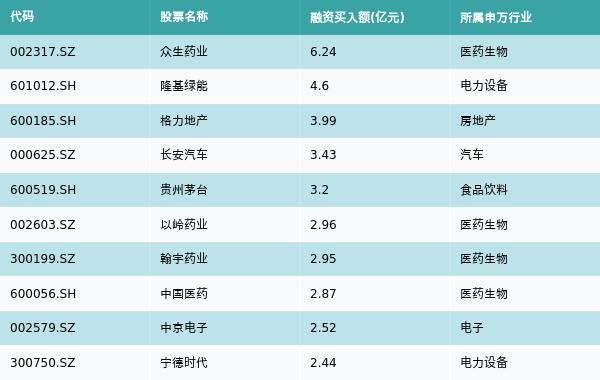12月22日,两市共有3097只个股有融资资金买入,其中众生药业、隆基绿能、格力地产排名前三,买入金额分别6.24亿元、4.6亿元、3.99亿元。融资买入额前10个股详情见下表: