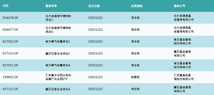 12月22日,有7只新基金发行,分别为:光大保德信专精特新混合C、光大保德信专精特新混合A、南方景气前瞻混合C、嘉实优享生活混合C、南方景气前瞻混合A、汇添富中证细分有色金属产业主题ETF、嘉实优享生活混合A,详情见下表: