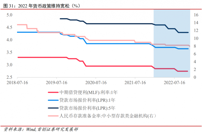 2022年,央行继续运用结构性货币政策工具,强化对重点领域、薄弱环节和受疫情影响行业的支持。具体政策上,货币政策加码宽松。2022 年共两次降准,两次调降MLF,