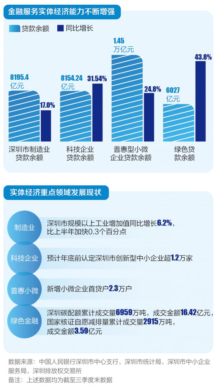 截至9月末,深圳市制造业贷款余额8195.4亿元,同比增长17.0%,高于各项贷款增速6.8个百分点。科技企业贷款余额8154.24亿元,同比增长31.54%。普惠小微贷款余额1.45万亿元,同比增长24.8%,高于各项贷款增速14.6个百分点。